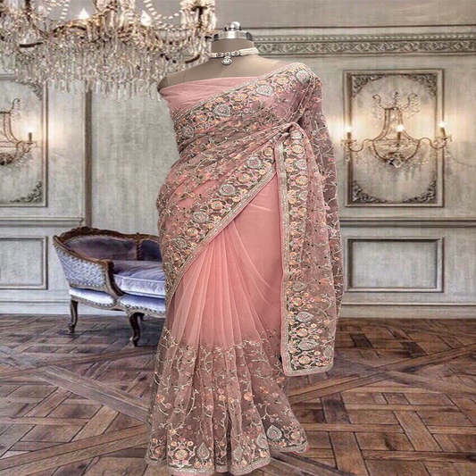 Fashionkiya Soft Net Saree with Blouse in Thread Sequence and Pearl Work Indian Outfit For Women